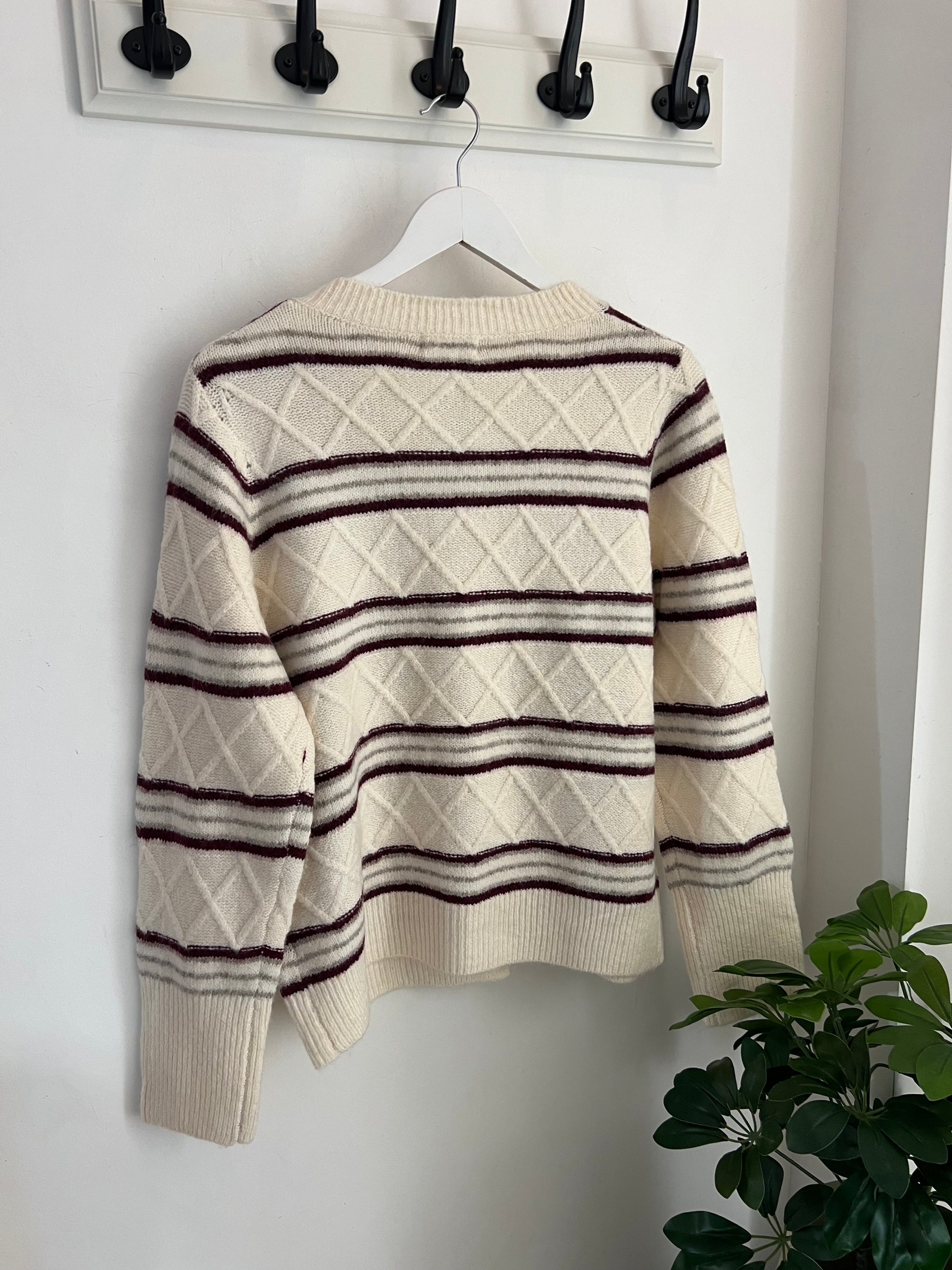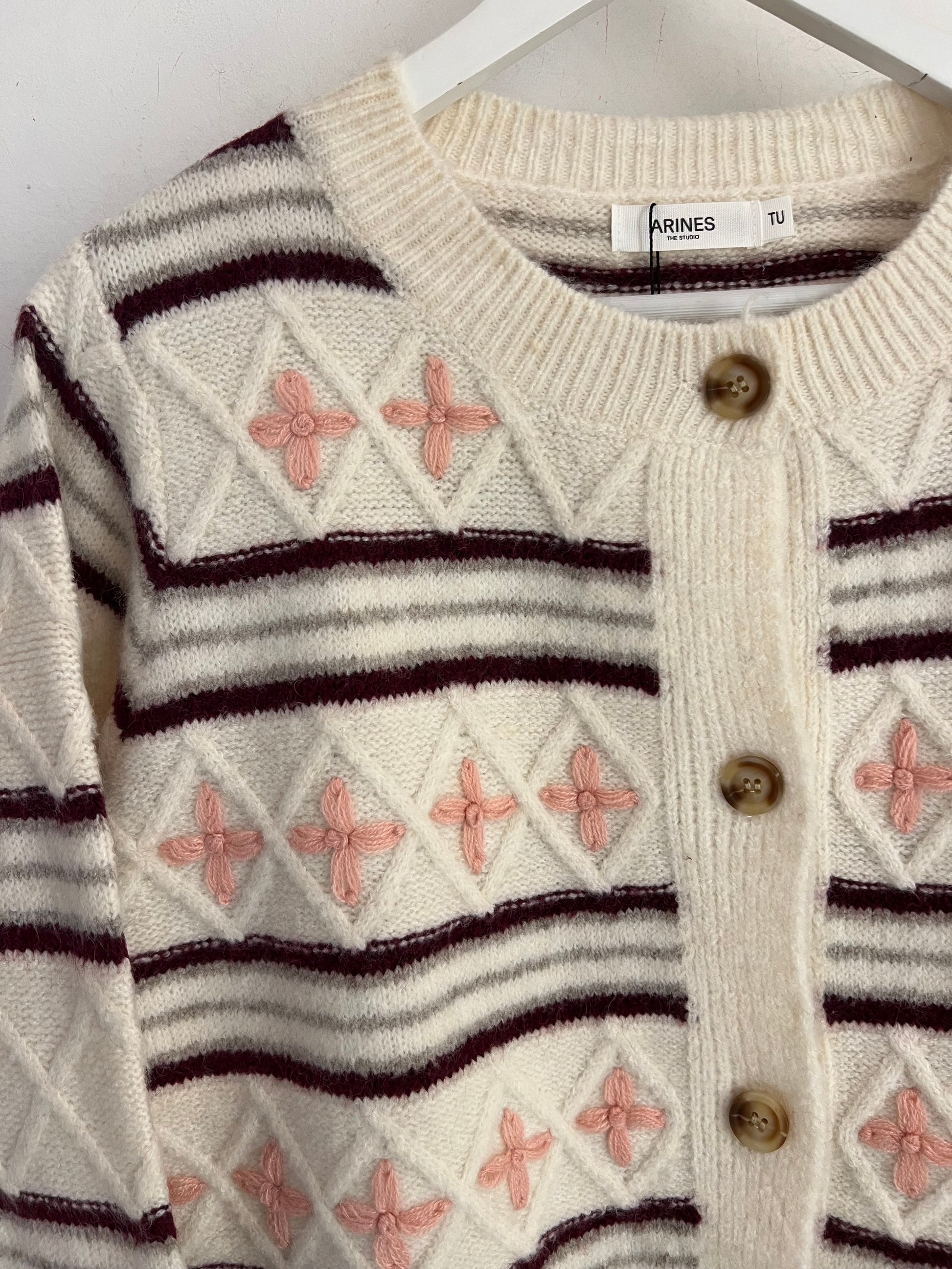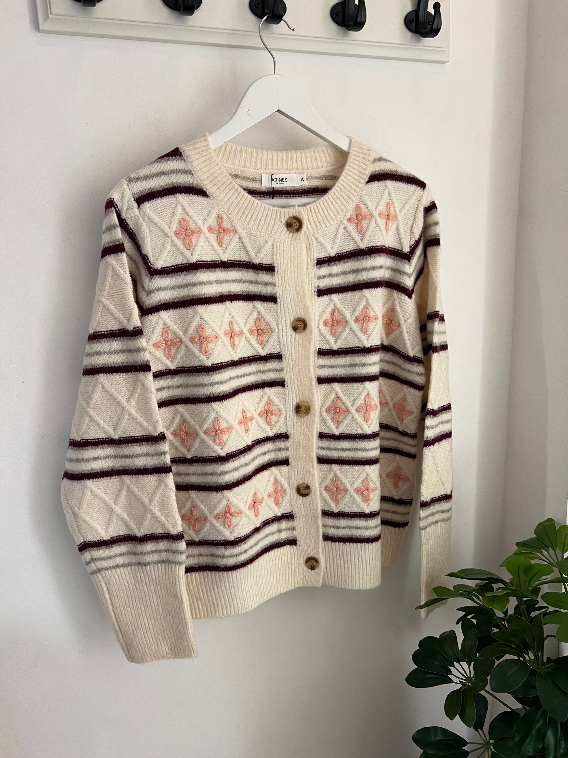 Der Cardigan Elfie verbindet winterliche Gemütlichkeit mit modernem Stil. Mit seinem klassischen Rundhalsausschnitt und langen Ärmeln ist er die perfekte Schicht für kühle Tage. Das charmante Streifenmuster kombiniert mit winterlichem Design schafft einen niedlich-schicken Look, der mühelos von der Freizeit ins Büro passt. Kuschelig weich und vielseitig kombinierbar – dein neuer Lieblings-Layering-Piece für die Saison.