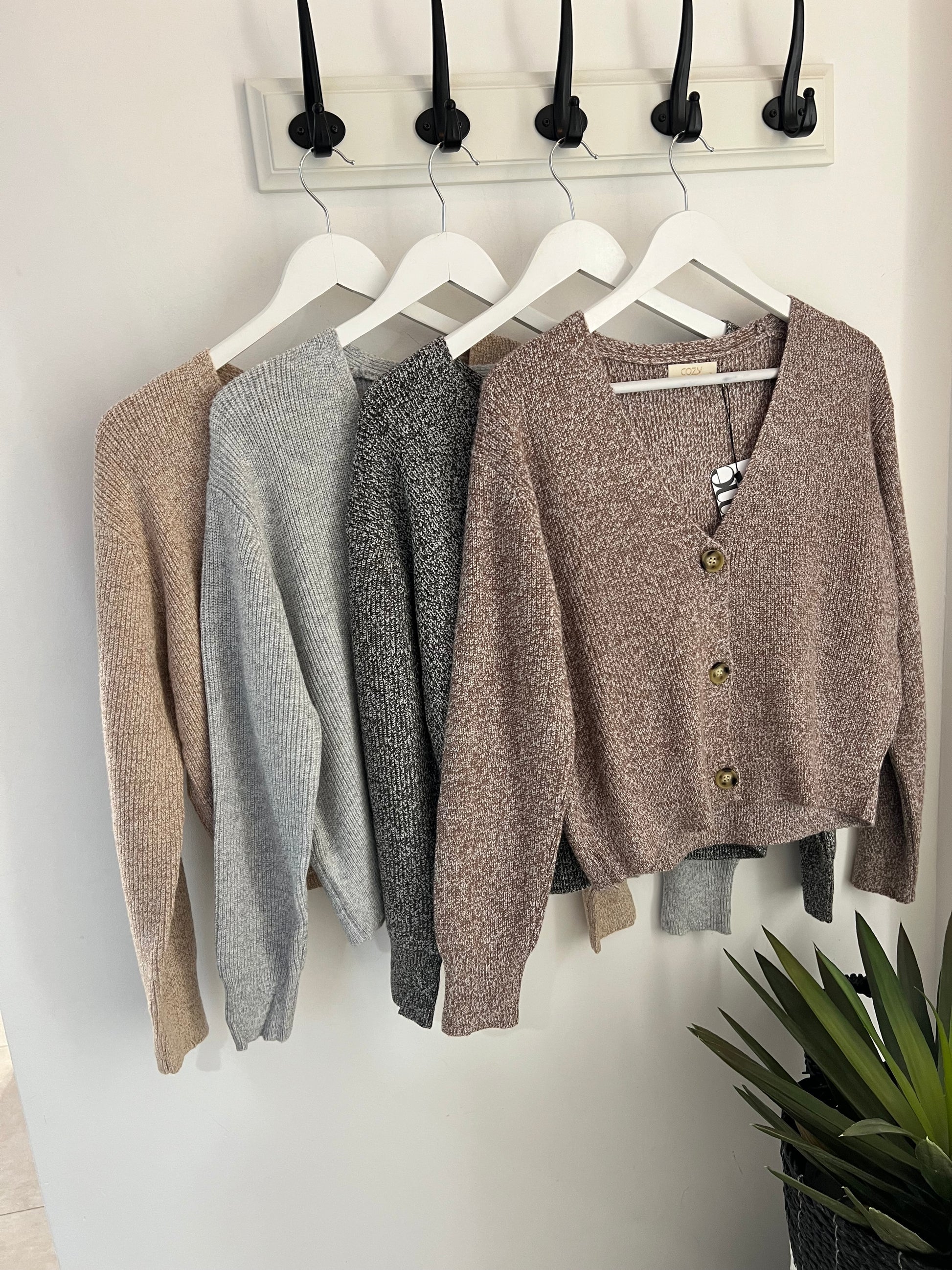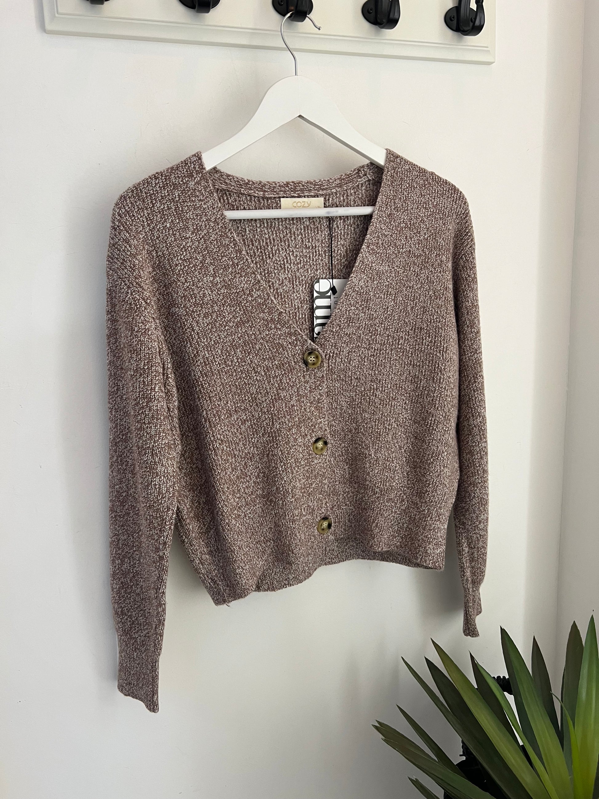 Dieser kurz geschnittene Cardigan mit meliertem Muster und braunen Knöpfen verbindet Komfort und Stil. Der V-Ausschnitt sorgt für einen eleganten Look, während die hochwertige Verarbeitung für Langlebigkeit und angenehmes Tragegefühl steht. Perfekt, um jedes Outfit unkompliziert aufzuwerten.