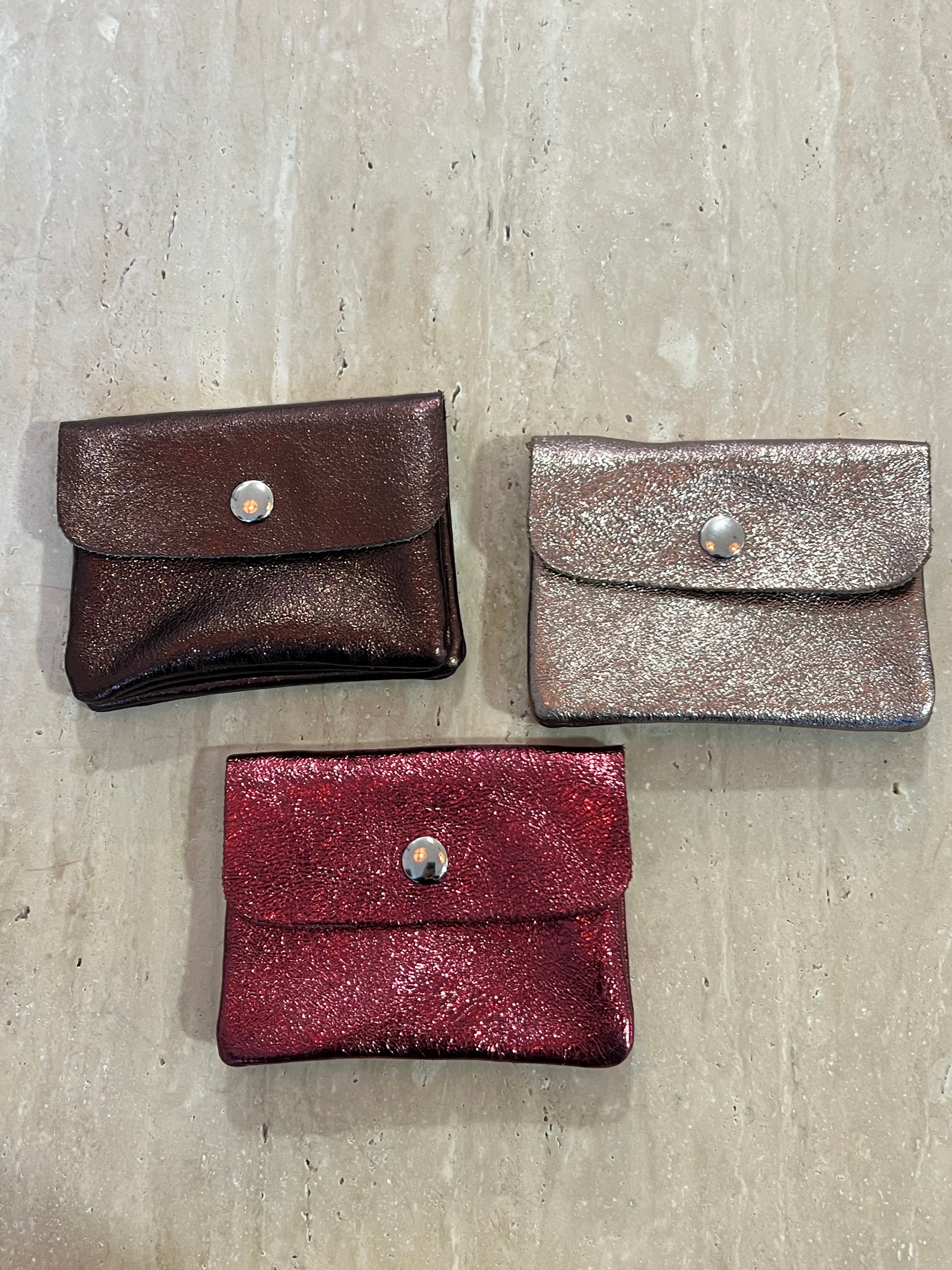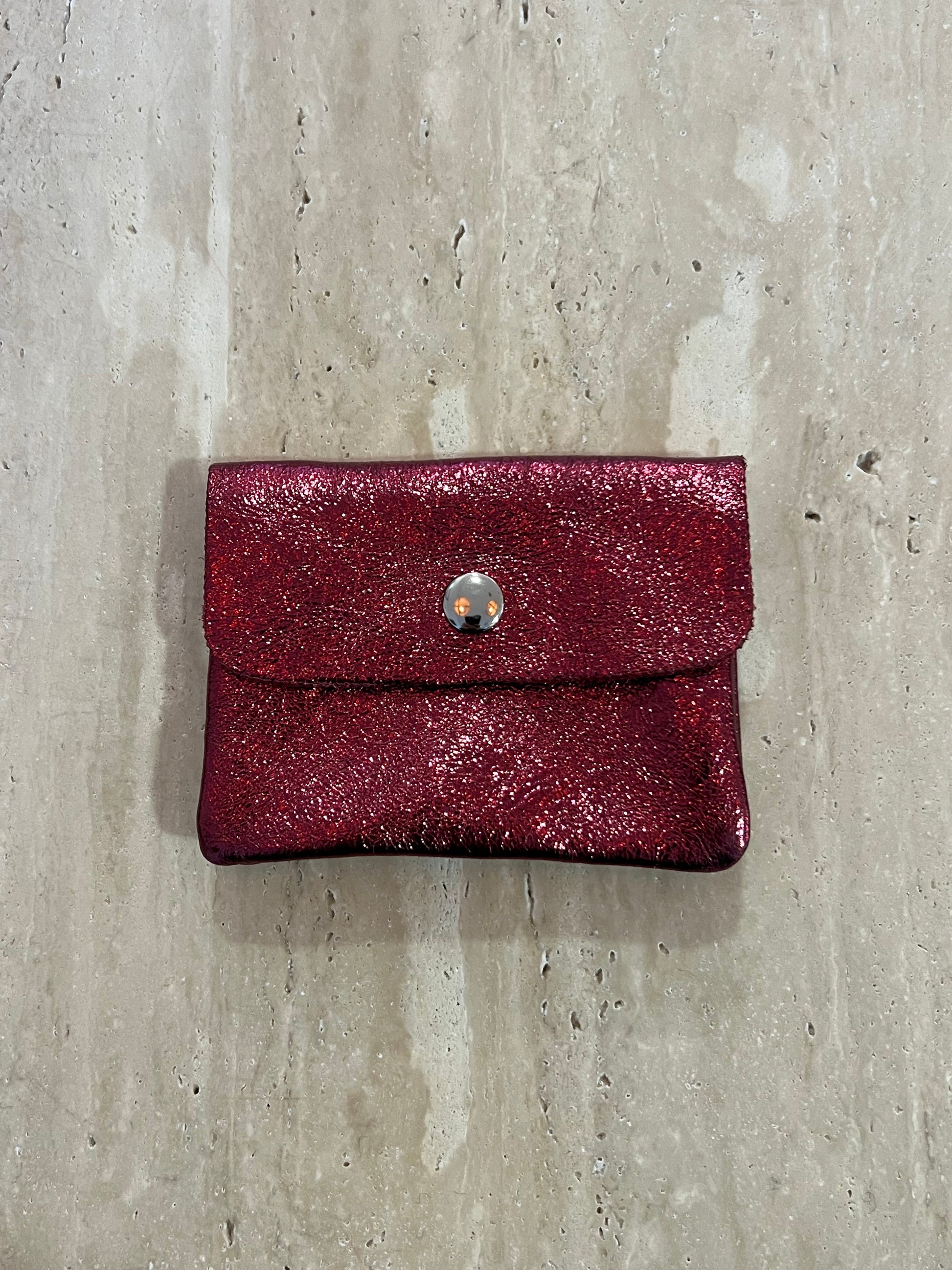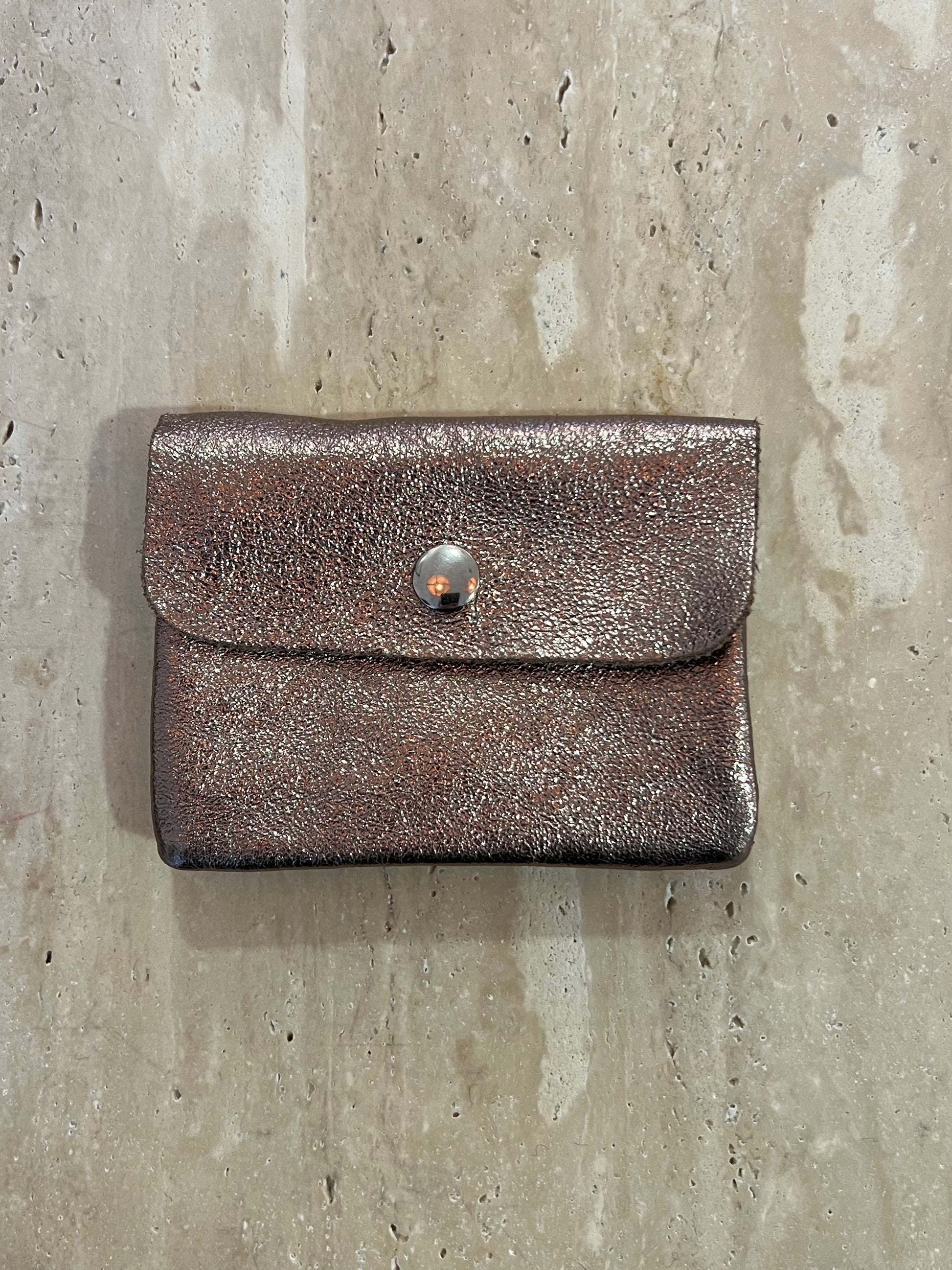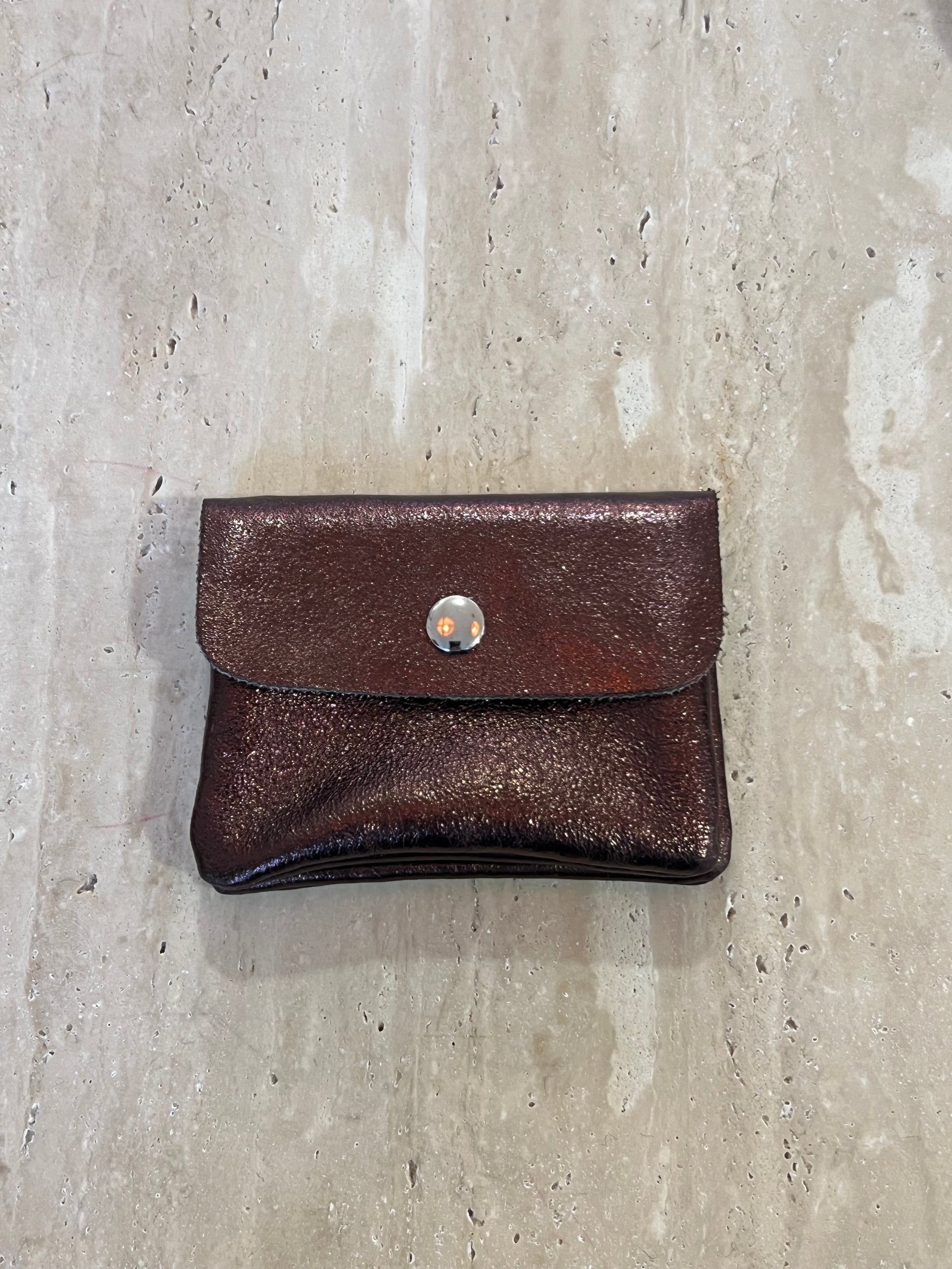 Kleine, niedliche Geldbörse aus Leder. Die Geldbörse kann mit einem Druckknopf verschlossen werden, innen hat sie ein offenes Fach und nochmal ein seperates Kleingeldfach, welches mit einem Reißverschluss verschlossen werden kann.