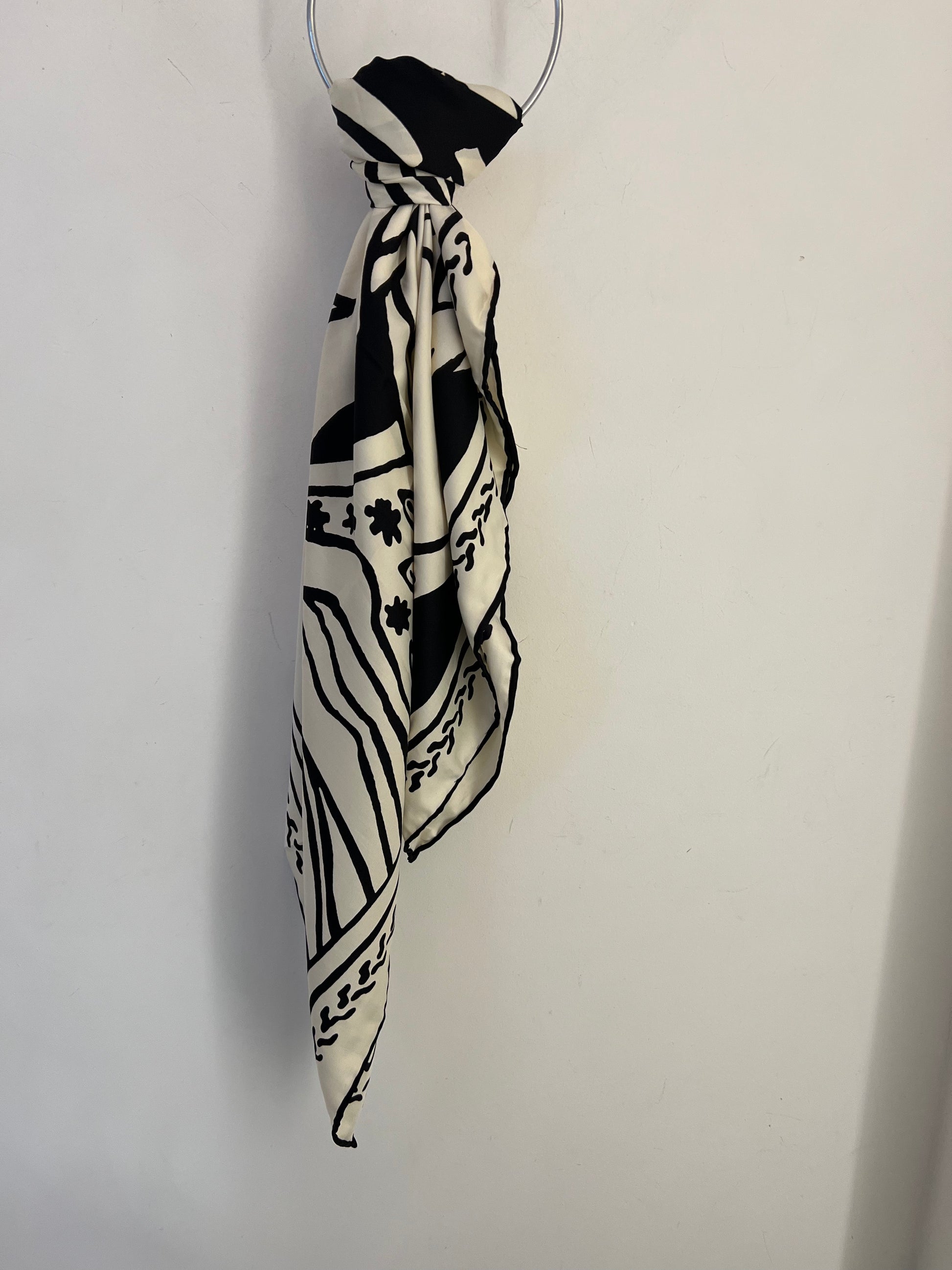 Elegantes Halstuch aus reiner Viskose mit abstrakten Pferd und Reiter Motiv in creme/schwwarz. Das quadratische Format von 90x90 cm bietet vielfältige Styling-Möglichkeiten – als Kopftuch, Halstuch, Schultertuch oder an deiner Handtasche. Die fließende Viskose schmiegt sich angenehm an und besticht durch natürliche Glanz und Geschmeidigkeit.