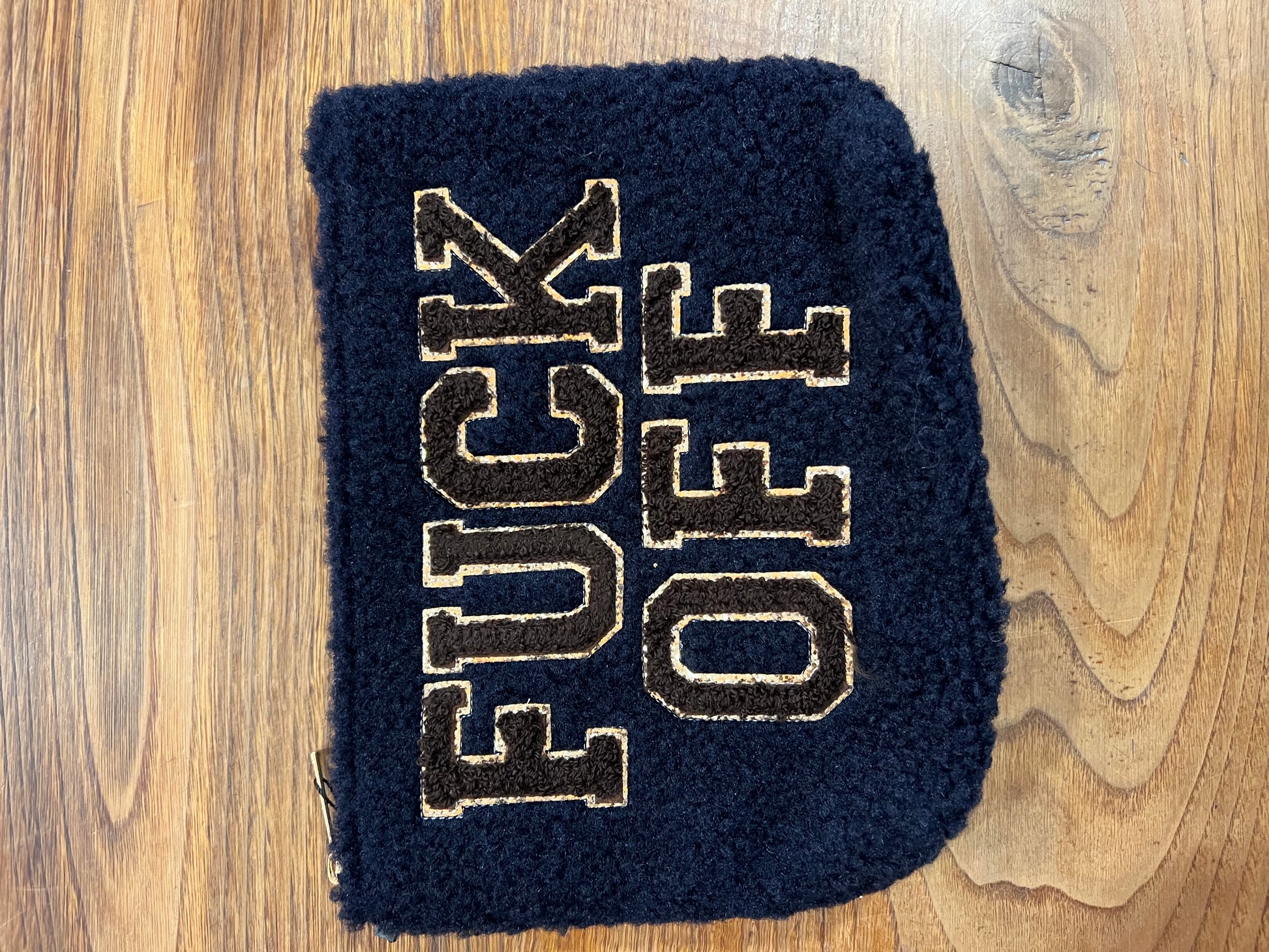 Kosmetiktasche mit aufgesticktem "FUCKOFF" Schriftzug auf Teddyfleece.