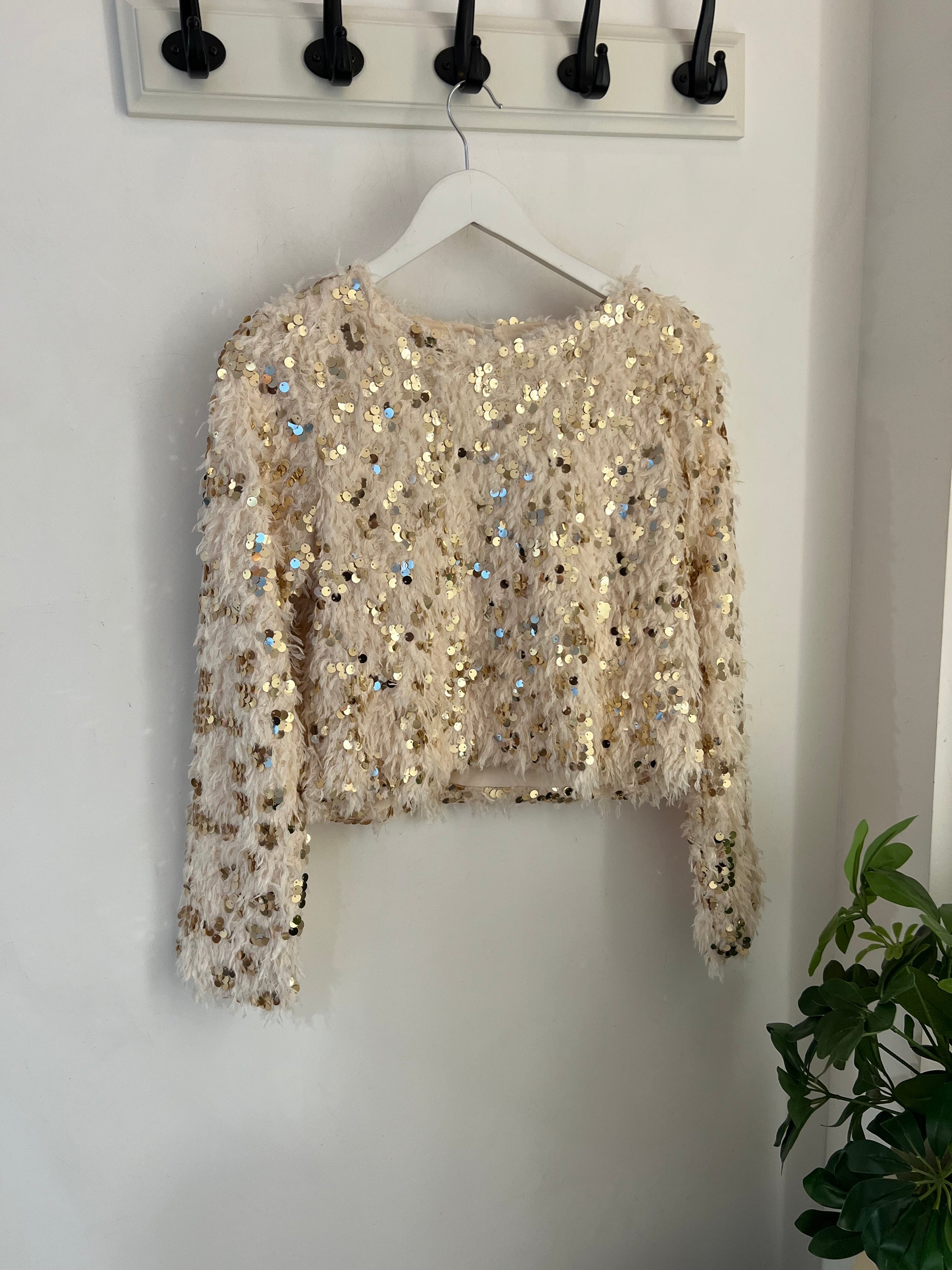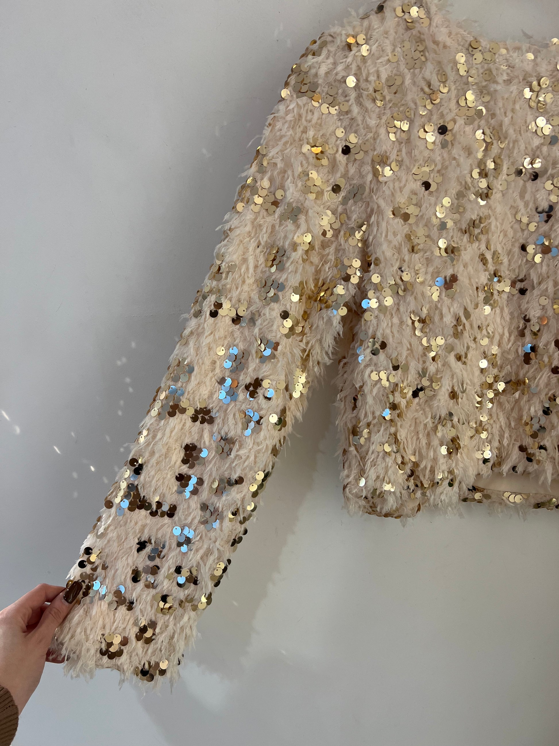 Elegantes Langarm-Oberteil mit aufwendiger Federn- und Pailletten-Verzierung. Das gerade geschnittene Design besticht durch seinen extravaganten Glanz und verleiht jedem Auftritt eine raffinierte Note. Die funkelnden Details fangen das Licht perfekt ein und schaffen einen luxuriösen Look. Ideal für besondere Anlässe und Momente, in denen Sie im Mittelpunkt stehen möchten. Ein Statement-Piece für anspruchsvolle Stilliebhaber.