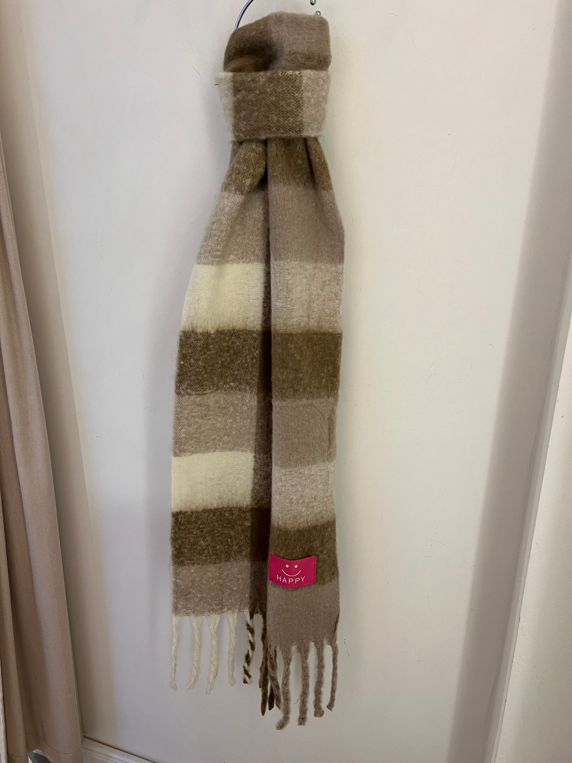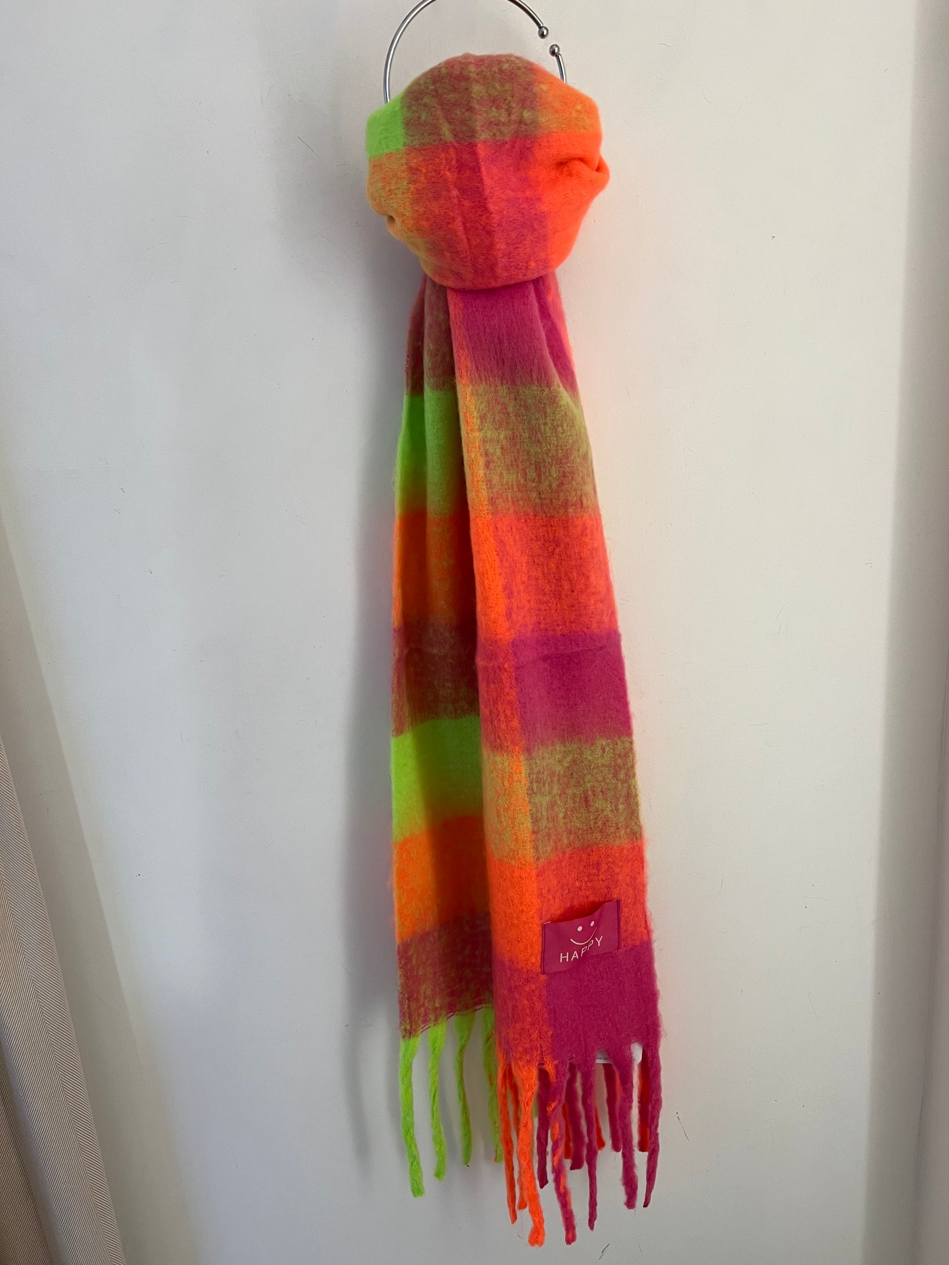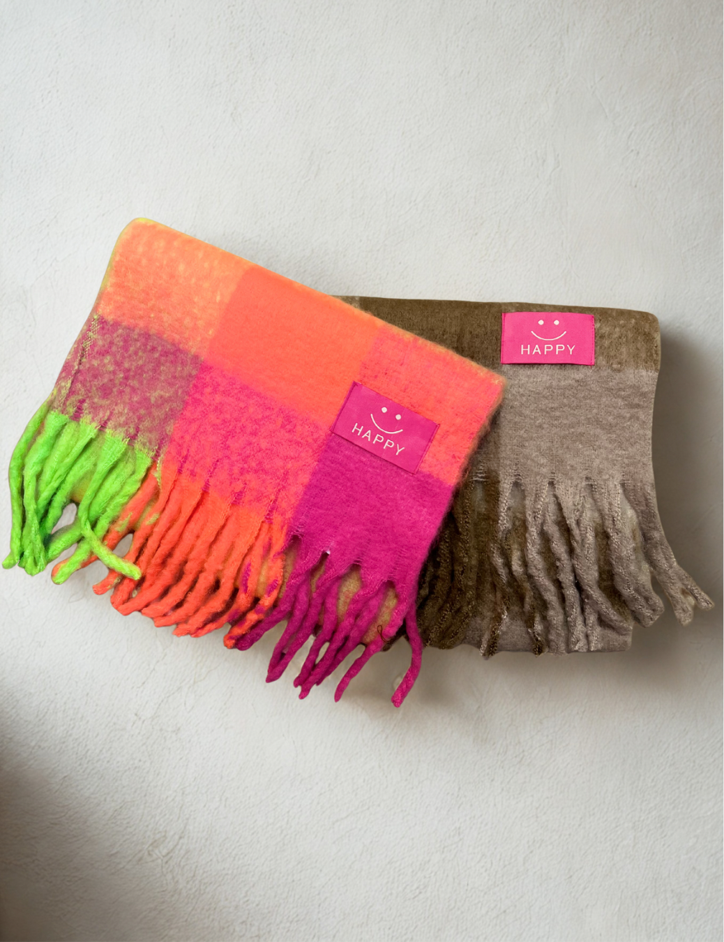 Entdecken Sie den Kuscheligen Schal „Happy“ – Ihr perfekter Begleiter für kalte Tage. Das flauschige, kariert gemusterte Design verspricht nicht nur wohlige Wärme, sondern auch einen stylischen Look. Aus 100 % Viskose, fühlt sich der Schal besonders weich auf der Haut an. Die verspielten Fransen und der pinke Aufnäher mit „Happy“ und einem Smiley setzen modische Akzente, die gute Laune verbreiten. Perfekt für winterliche Outfits, vereint er Komfort und fröhlichen Stil in einem.