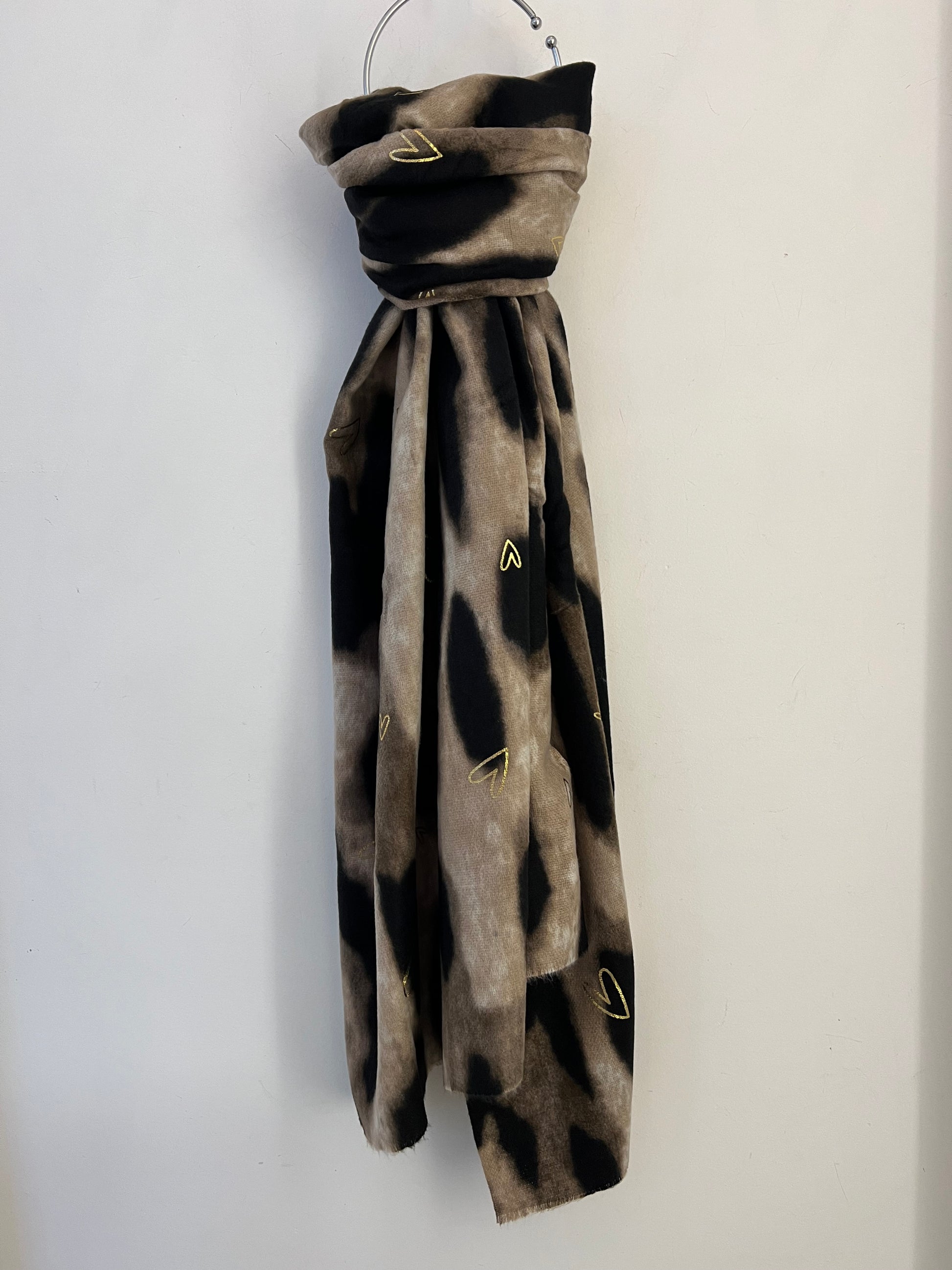 Der Schal Susi verbindet zarte Leichtigkeit mit wohliger Wärme. Hergestellt aus 100 % weicher Viskose, schmiegt er sich sanft an Ihrer Haut. Das braun gefleckte Muster mit goldenen Herzen verleiht jedem Outfit einen stilvollen Akzent. Ideal für kühle Tage, bei denen Sie nicht auf Komfort und Eleganz verzichten möchten.