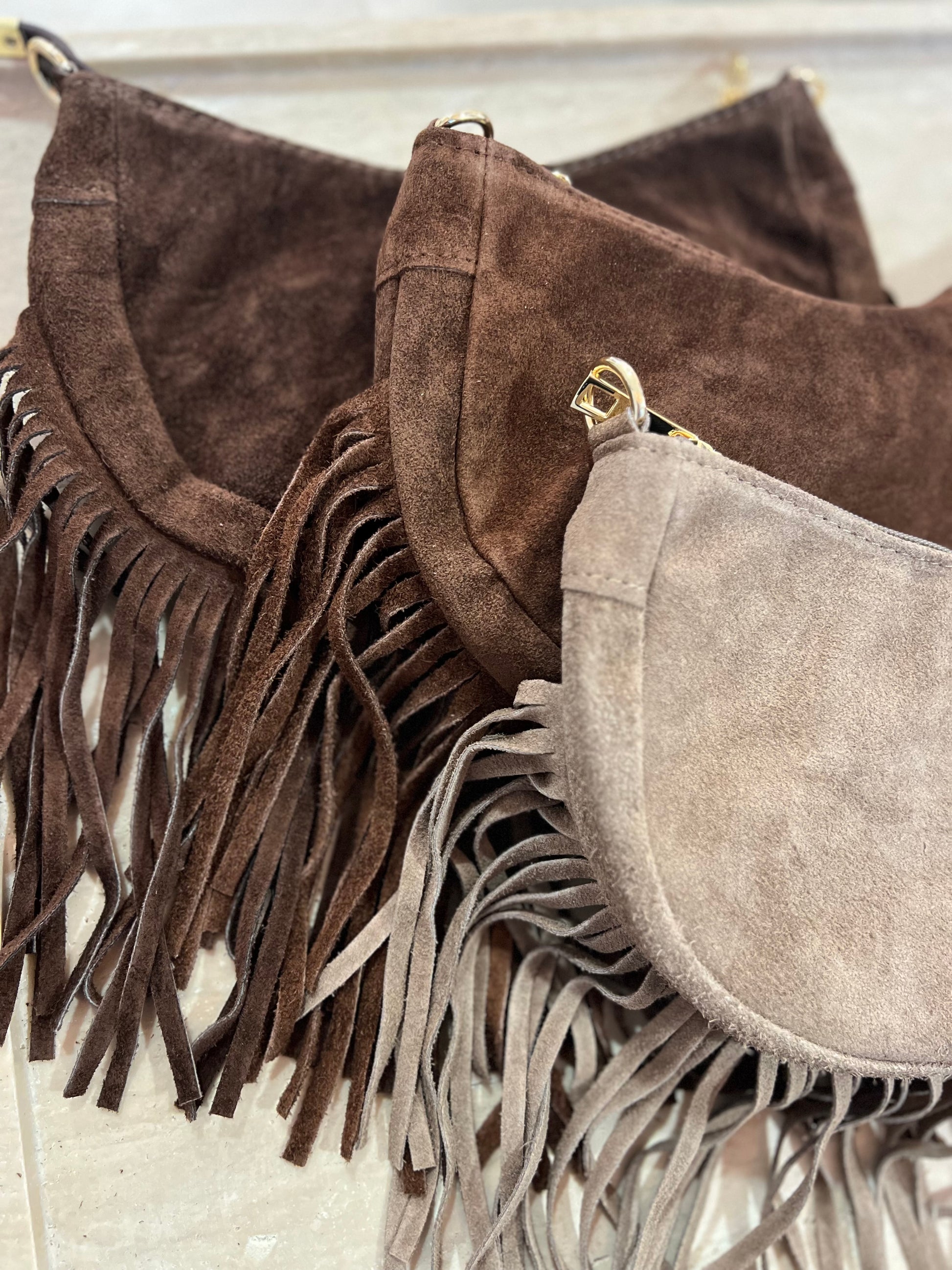 Die Wildledertasche Corinna überzeugt mit hochwertigem Wildleder, das für eine natürliche, elegante Optik sorgt. Der verstellbare und austauschbare Gurt ermöglicht flexible Tragevarianten, während die dekorativen Fransen der Tasche einen trendigen, individuellen Look verleihen. Perfekt für alle, die Stil und Funktionalität in einem Accessoire suchen.